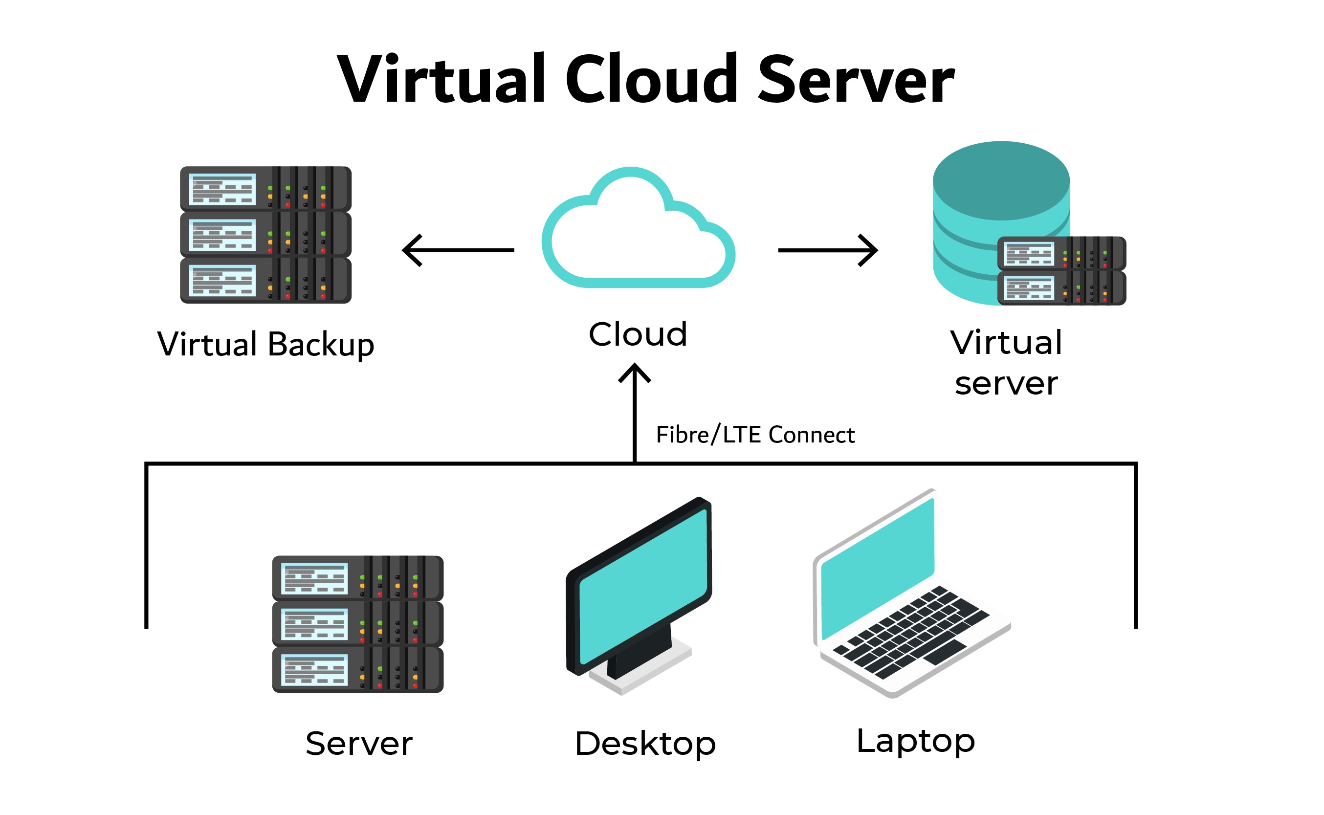 Simple Network Diagram of How a Business laptop,Computer or Server would connect over Cloud services using Secure WAN connecting to the Hosted Server/Backup.
